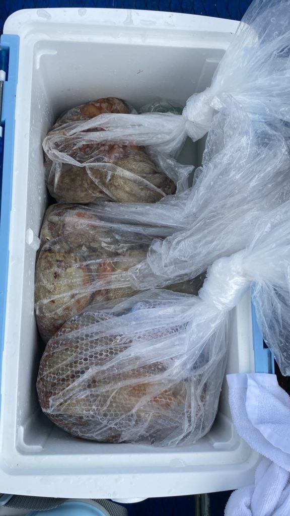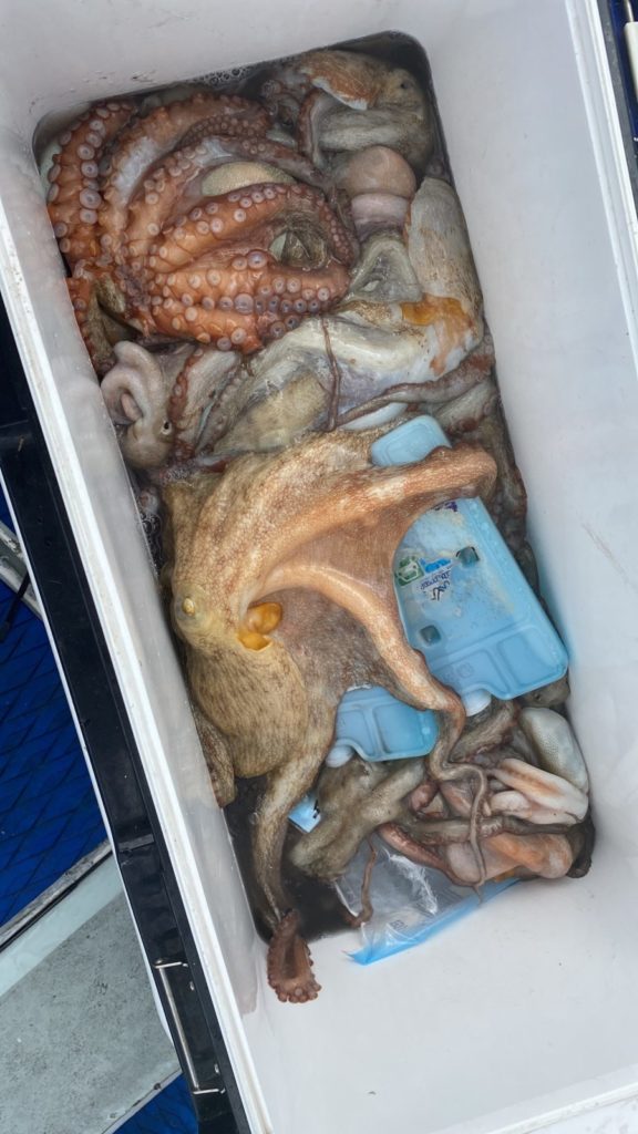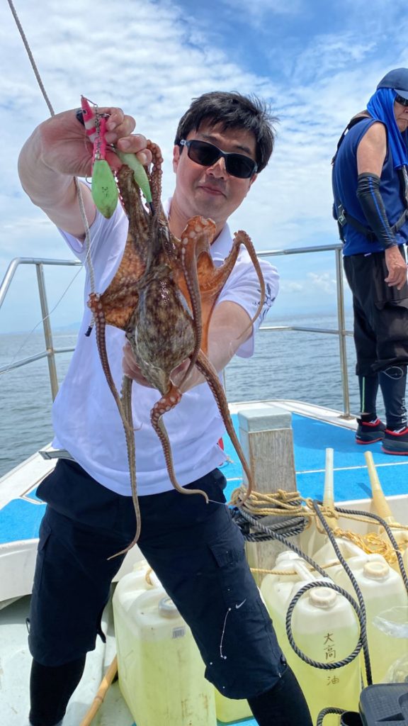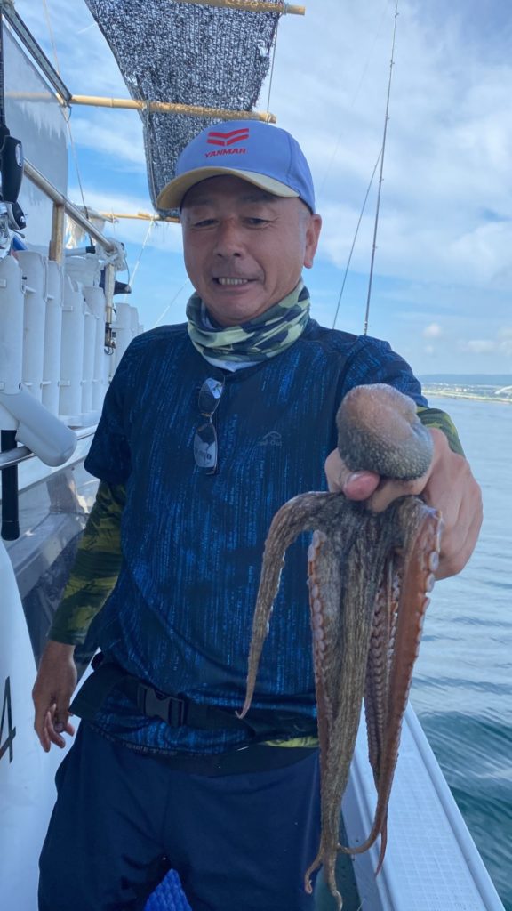 本日はマダコ釣りで出船!個人的にはよく当たりもあってリベンジのお客さまもたくさん釣れて喜んでもらえました。暑すぎて途中バテてリタイヤのお客様も居られましたので、全員大漁では有りませんでしたが概ねよく釣れたと思います。